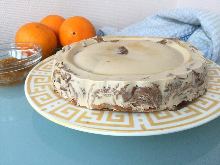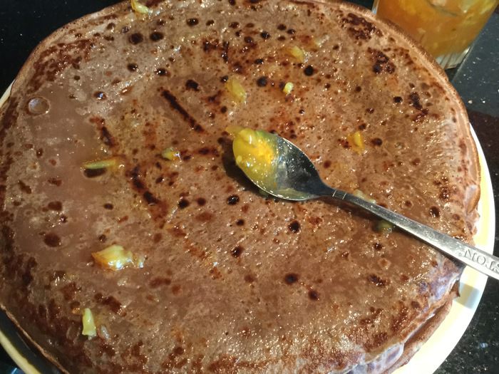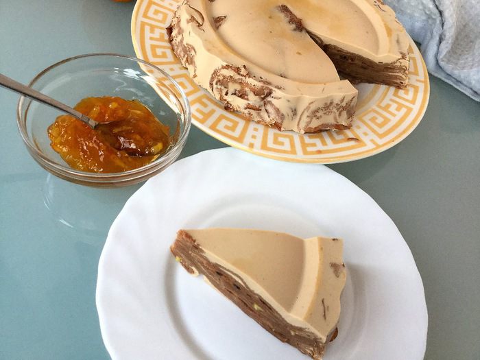 Смажьте каждый блинчик апельсиновым джемом и сверните. Плотно сложите блинчики в силиконовую форму.