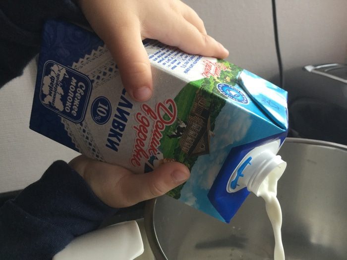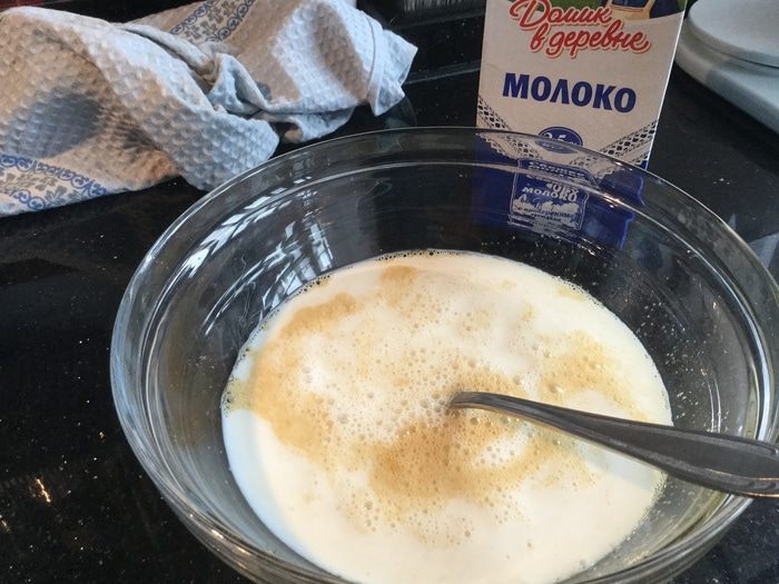 Добавьте половину молока «Домик в деревне» и перемешайте.