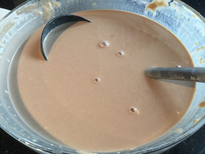 Просейте муку и какао, перемешайте, влейте оставшееся молоко и растительное масло и еще раз хорошо перемешайте, чтобы не было комочков.