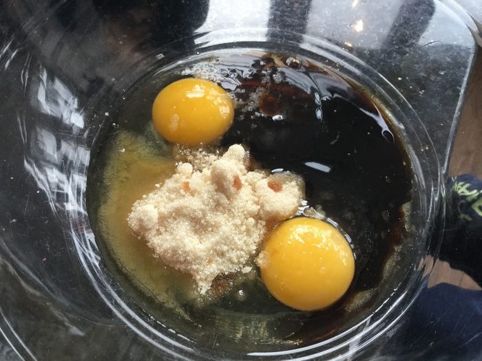 Сначала приготовим шоколадно-кофейные блинчики: взбейте венчиком яйца, соль, сахар и кофейный сироп.