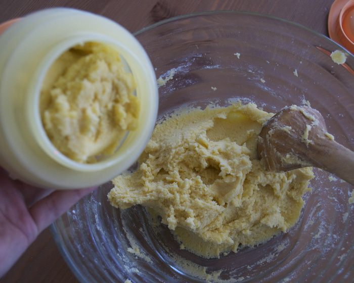 Добавить к сухой смеси размягченное сливочное масло кусочками. Перемешать.