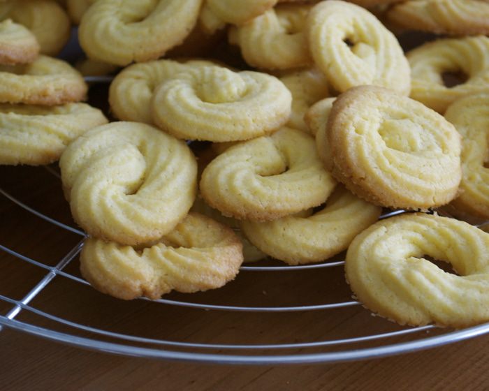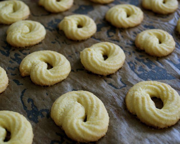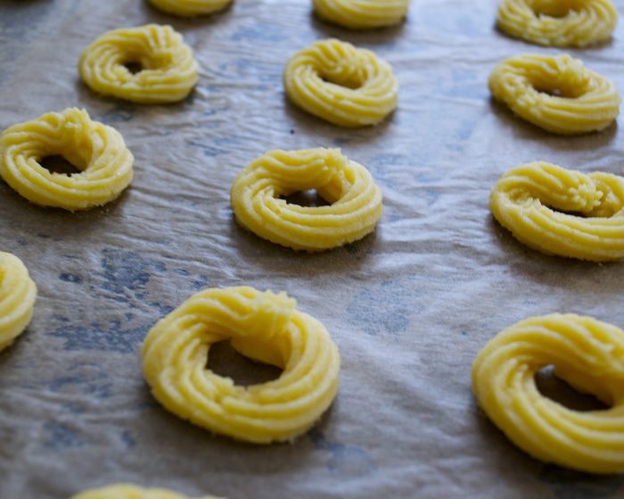 Противень смазать в нескольких местах маслом и накрыть листом пекарской бумаги. Печенье отсадить на противень в виде маленьких бубличков...