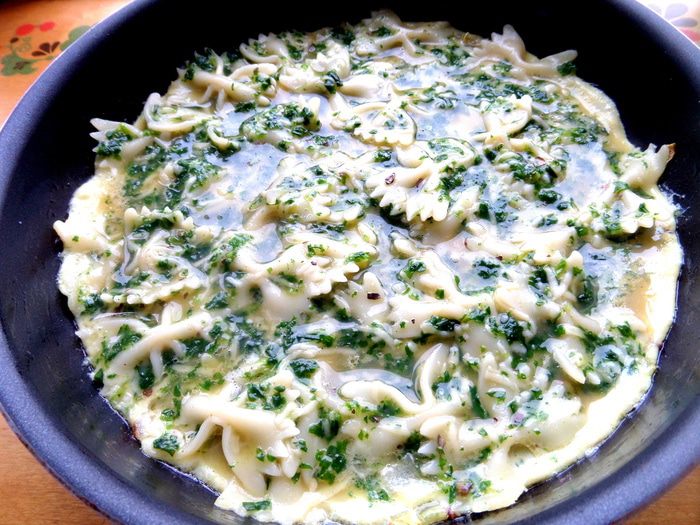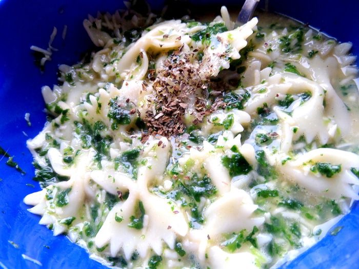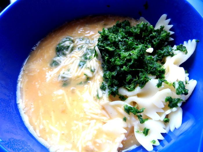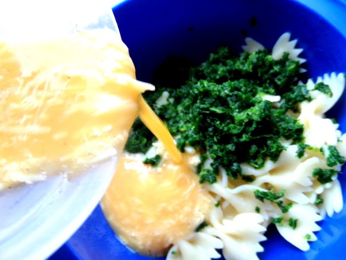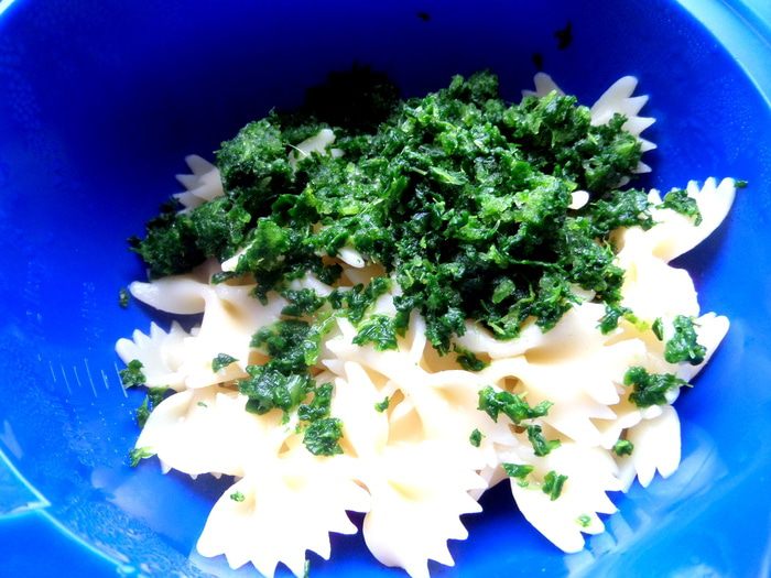 Макароны откинуть на сито,а затем соединить со шпинатом.