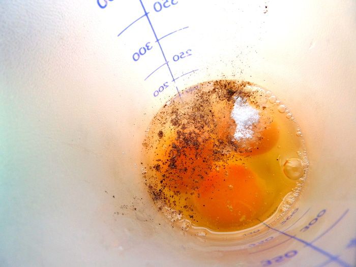 Пока они варятся,в шейкере взбиваем яйца с солью,мускатным орехом и перцем.