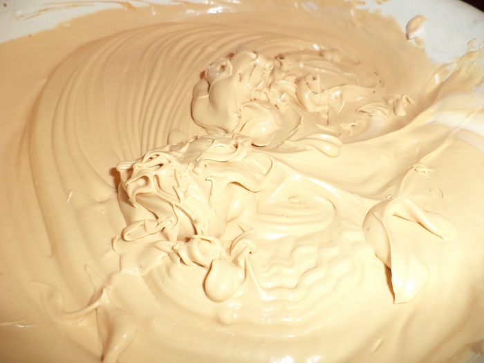 Понемногу добавлять взбитые сливки в сгущёнку, взбивая миксером.