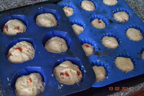 Подошедшее тесто разделить на равные кусочки и выложить на смазанный маслом противень... или разложить по силиконовым формочкам для кексов, как я... накрыть и дать отдохнуть еще 20 мин.