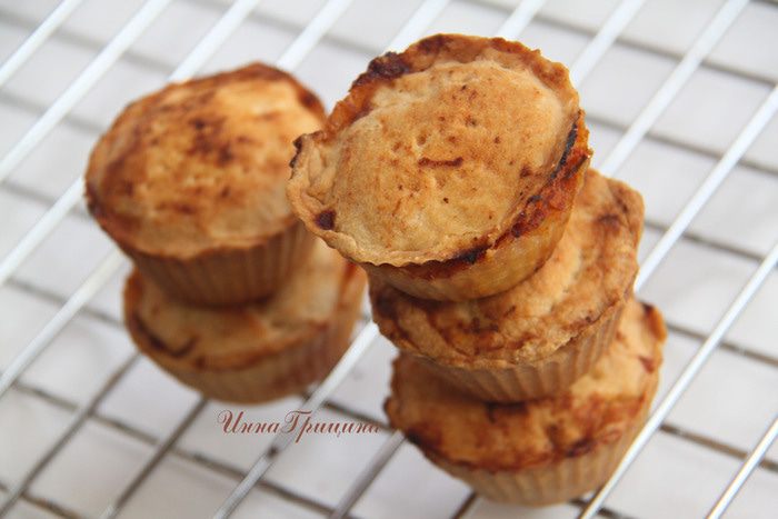 Тесто сначала скатать в шар, затем в рулон, разделить на 18 частей. Каждую из этих частей разделить на две неравные части. Из большей части сформировать лепёшку и положить её в формочку (лучше силиконовую). Заполнить начинкой (отложить пару ложек жидкости из рагу) и закрыть второй лепёшкой, которую сделать из меньшего кусочка. Таким образом налепить 18 пирожков.