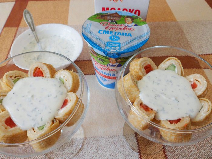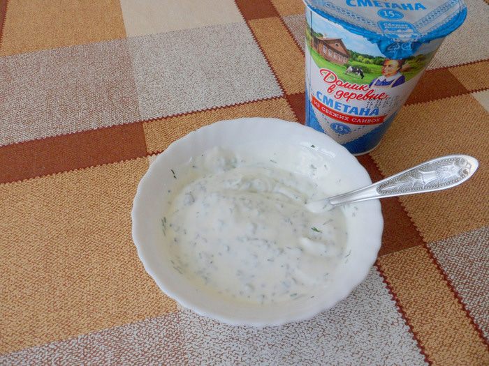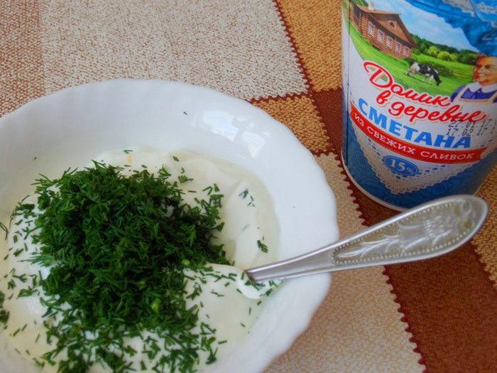 Сверху выкладываем столовую ложку сметаны с укропом.