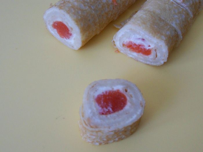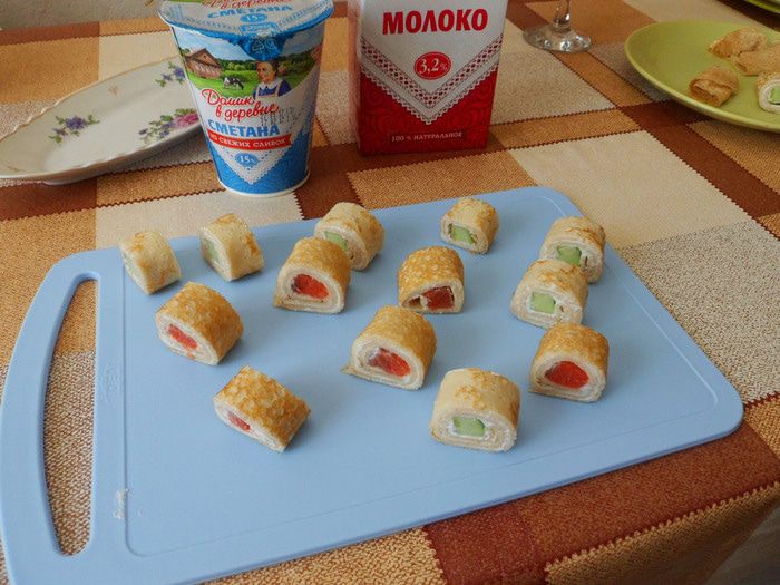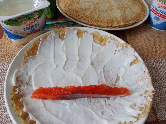 Нарезаем блин с семгой.