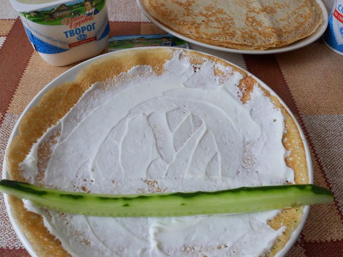 Второй блин намазываем творожно-сметанной смесью, укладываем брусочек огурца.