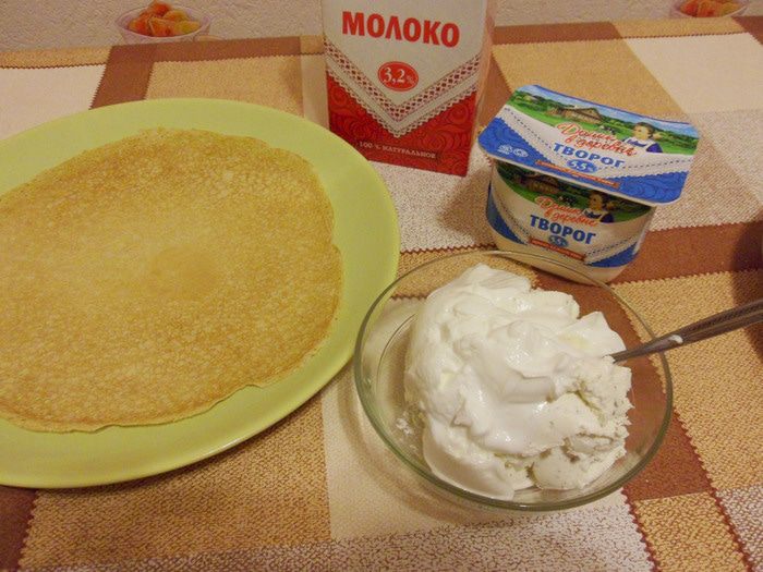 Для приготовления этого блюда мне нужны тонкие пластичные блины. Я их приготовлю по своему рецепту «Блинная запеканка «Десертная»».