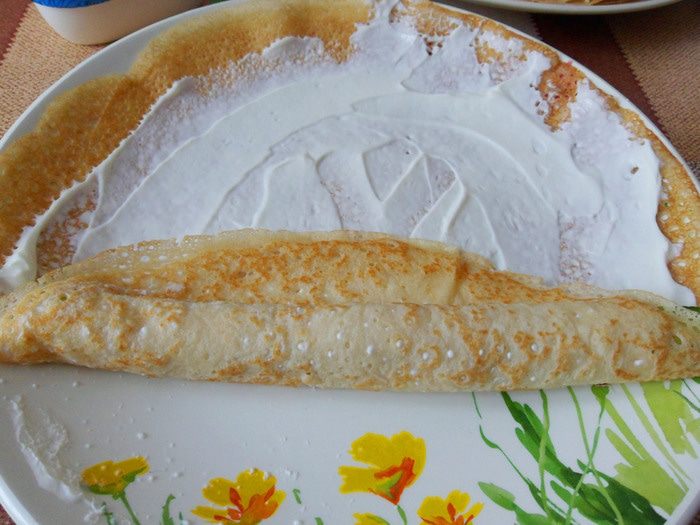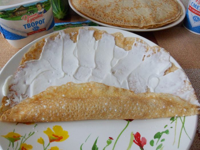 Намазываем творожно-сметанным кремом первый блин.