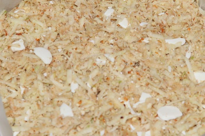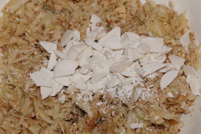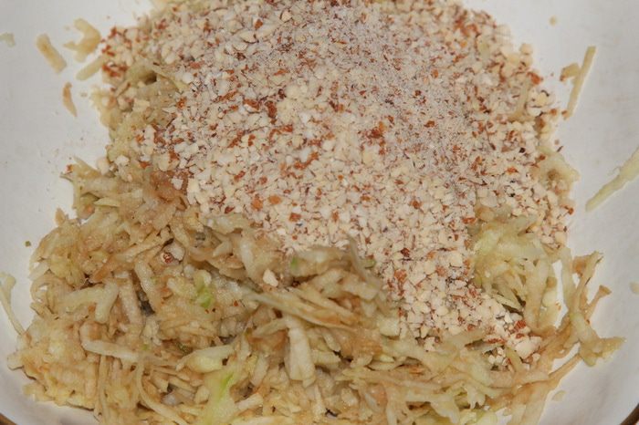 Яблоки очищаем от кожуры и серединки, натираем на крупной терке и отжимаем. У меня яблоки были сочные, получилось почти 120 мл сока (очень вкусный!). Миндаль перетираем в блендере до крошки и добавляем к яблокам.
