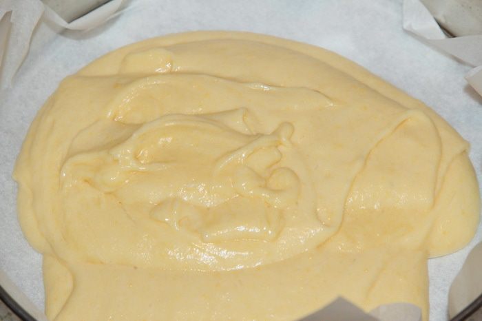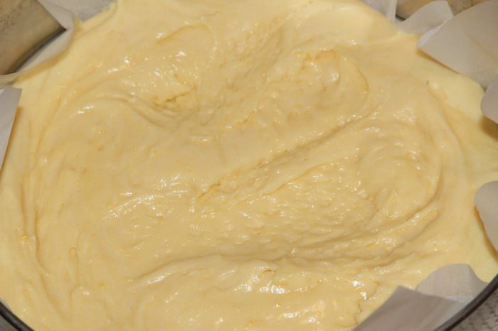 Форму выстилаем пекарской бумагой и выкладываем туда тесто.