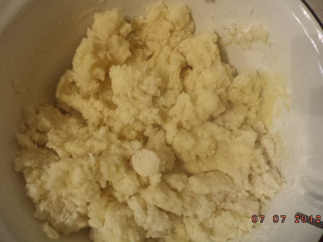 Добавить в остывшее пюре 3 яйца, взбитые венчиком, муку, немного посолить и замесить мягкое тесто.