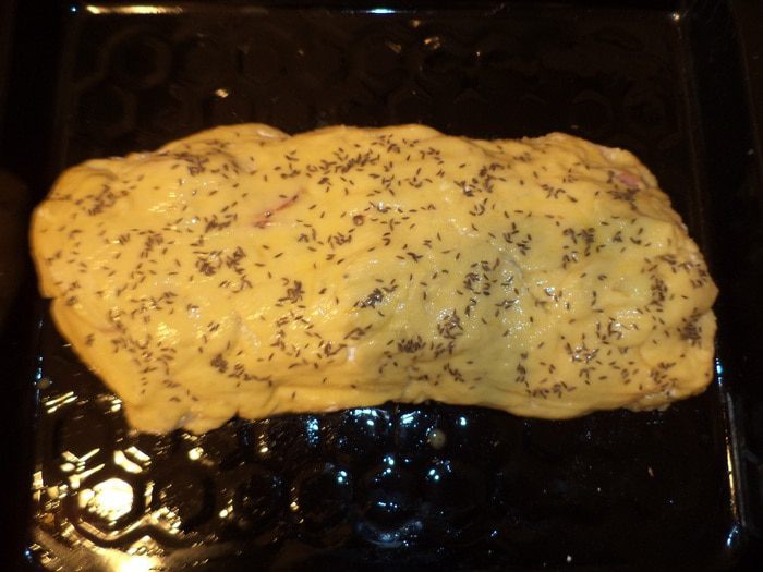 Сверху посыпать колбасу мелко нарубленной зеленью. Свернуть рулетом, тщательно защипив края. Переложить рулет на смазанный маслом противень,смазать взбитым яйцом, посыпать тмином. Запекать при температуре 200 градусов 30 - 40 минут.