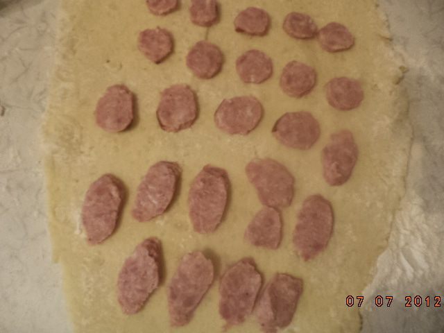 Колбасу нарезать тонкими ломтиками. Выложить ломтики на пласт теста довольно близко друг к другу, края необходимо оставить без начинки.