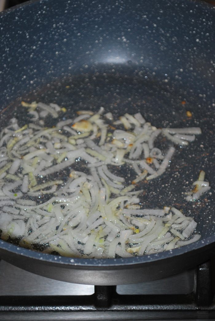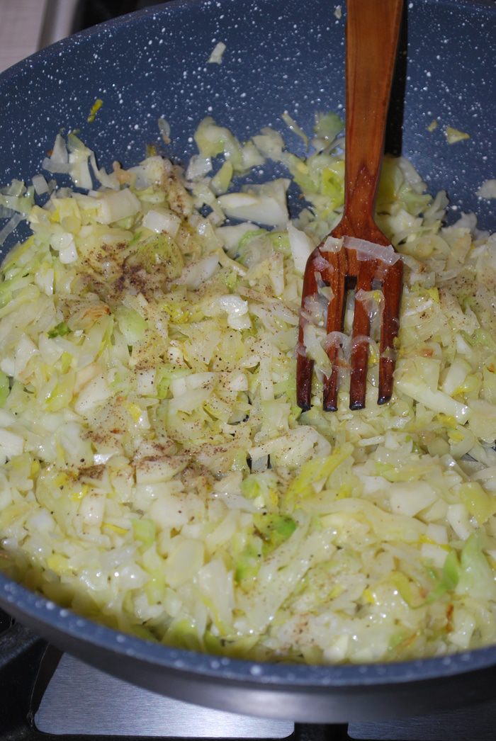 К луку добавляем капусту, обжариваем, солим и перчим по вкусу.