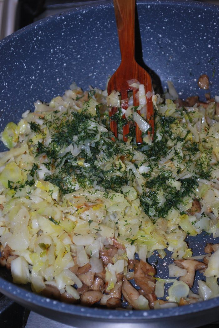 Соединяем капусту с луком и грибами. Добавляем по вкусу зелень.