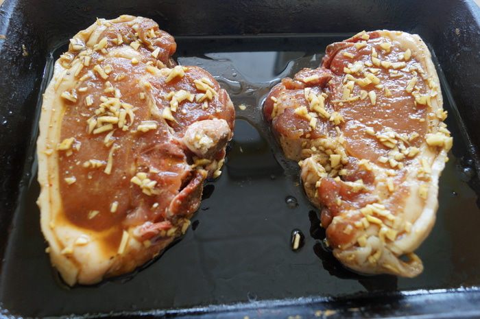 Противень смазать маслом и выложить на него свиные отбивные, сверху полить маринадом. Поставить мясо запекаться в духовку разогретую до 160-180 градусов на 1,5-2 часа.