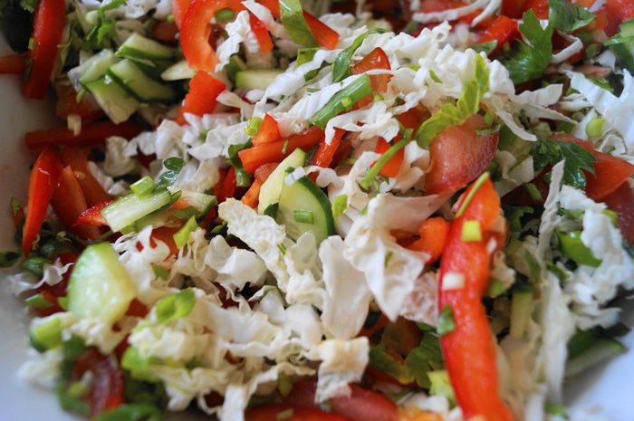 Для салата: нарезать все овощи, посолить и заправить оливковым маслом.