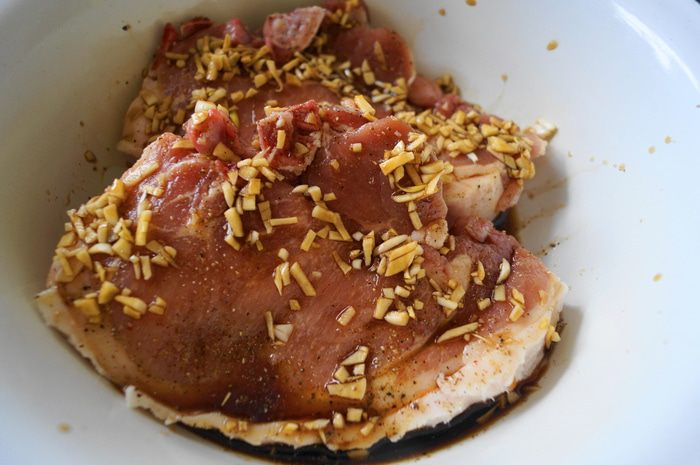 Отбивные выложить в большую миску и залить медово-соевым соусом. Оставить мариноваться на 1-1,5 часа, периодически переворачивая с одной стороны на другую.