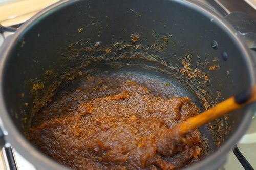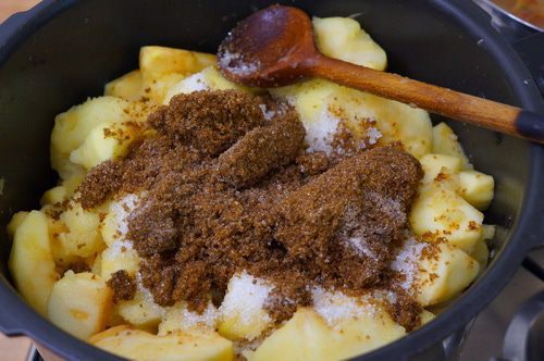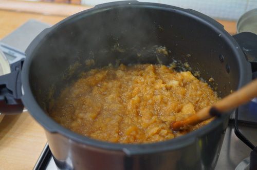 Выпариваем влагу, постоянно помешивая, не давая подгореть яблочному пюре. Если есть яблочные комочки ( у меня яблоки одного сорта хорошо разваривались), их нужно потолочь. Не забудем удалить коричную палочку, она уже достаточно хорошо ароматизировала яблочное пюре.