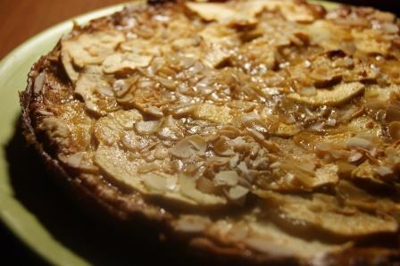 Горячий пирог залить заливкой, посыпать миндальными лепестками. Выпекать при 160 гр. 25 минут.
