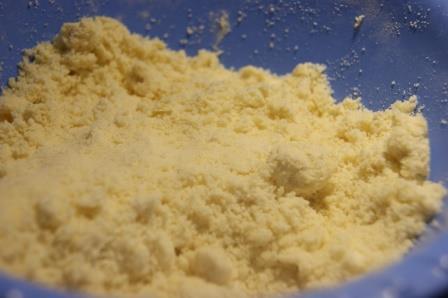 Готовим песочное тесто. Холодное масло порубить кубиками, смешать с сахаром и мукой в крошку.