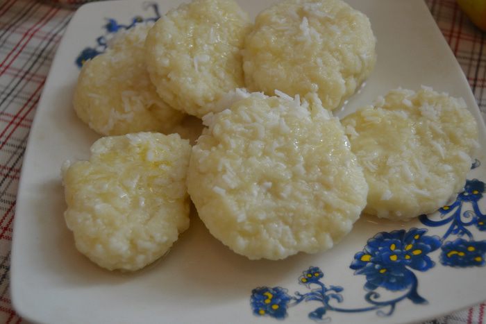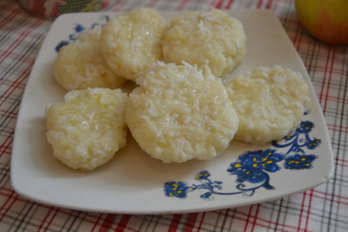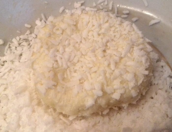 Формируем вареники: от общей массы теста отщипываем кусочек, скатываем его шариком и расплющиваем в «монетку», толщиной 1 см. Каждый вареник обваливаем в кокосовой стружке, немного прижимая, чтобы она налипла на тесто. Из этого количества теста у меня получилось 18 вареников.
