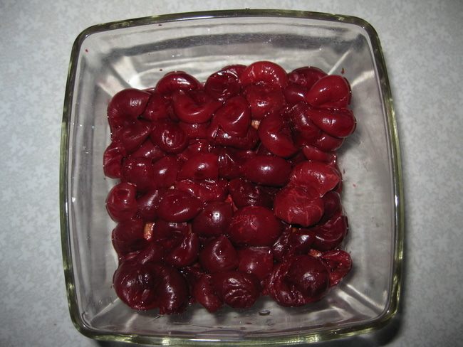 Затем выкладываем размороженую вишню без косточек. Или свежую в сезон.