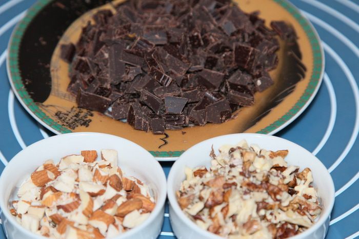 Орехи и шоколад рубим крупно.