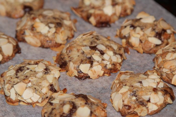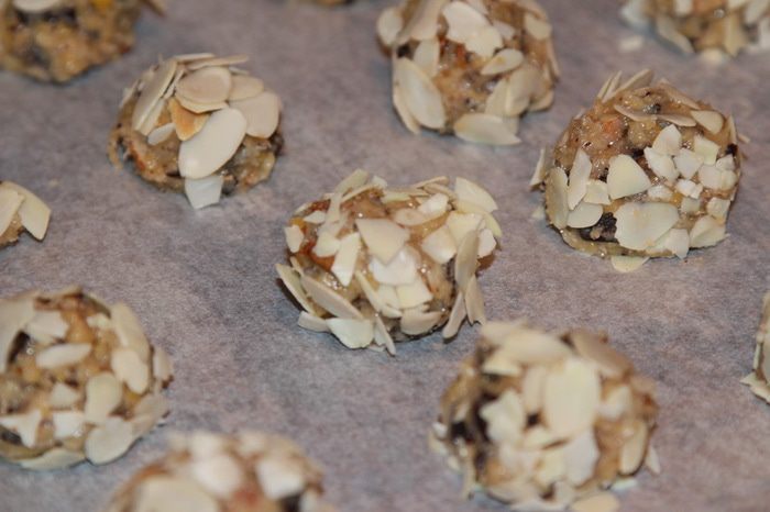 Теперь отщипываем от теста кусочки размером с грецкий орех, слегка катаем в ладошках в шарик, затем в миндальных крошках обваливаем и раскладываем на противне на расстоянии друг от друга 3 - 4 см. Печенье расплывется в духовке.