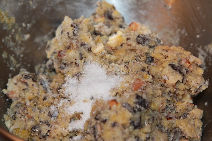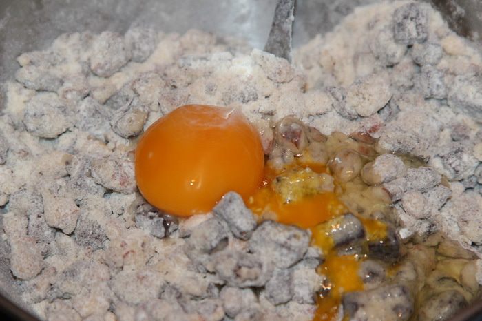 Теперь добавляем яйцо и быстренько все вымешиваем. Отправляем в холодильник чуть-чуть охладиться.