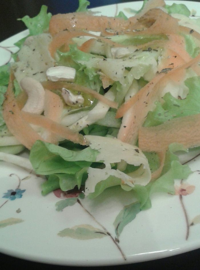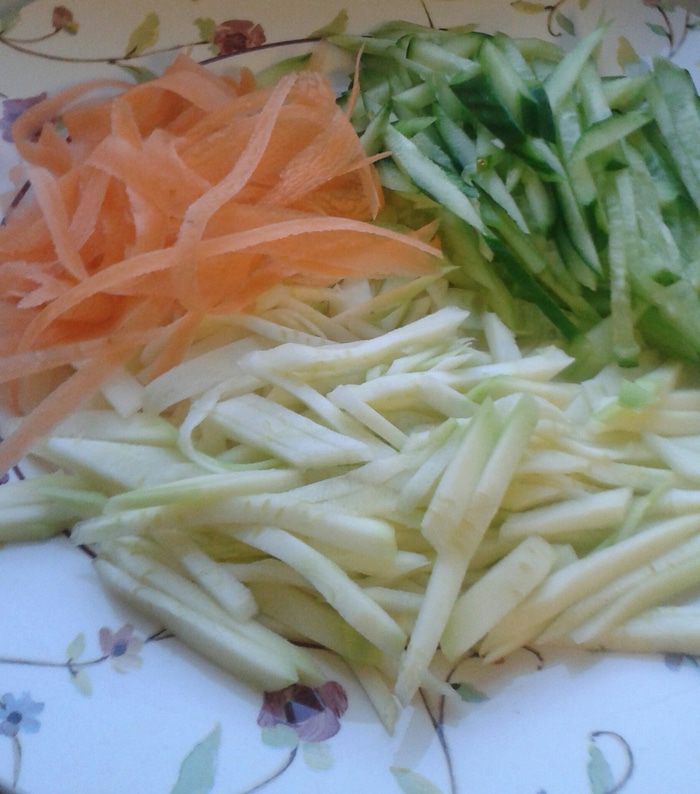 Разорвите листья салата и положите их в салатницу. Нарежьте мелкой соломкой цукини, очищенный огурец. Морковь можно нарезать «чистелкой» для овощей, так же можно нарезать сыр. Приготовьте заправку: соедините оливковое масло с лимонным соком и приправьте солью, перцем, травами.