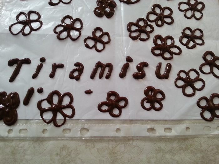 К великому сожалению, второй банки сливок я купить уже не смогла - дефицит, и оставить немного от основной массы также не догадалась. Пришлось выкручиваться. На листе бумаги написала слово (раза с 4-го), вставила в файл. Растопила 50 гр. шоколада в микроволновке (на программе "разморозка", постоянно помешивая). Совет таким же новичкам как и я: сделать еще какие то рисунки, которые можно будет нарисовать шоколадом. 50 гр. - это оказывается так много, можно рисовать и рисовать. Я сделала цветочки, аккуратными они получились не все. Оставляем до полного высыхания.