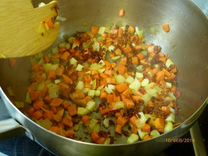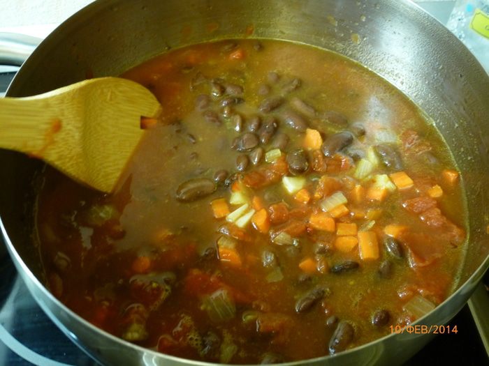 Вливаем овощной бульон, добавляем вареную фасоль и рубленные помидоры. Готовим на среднем огне 30 минут, фасоль должна развариться.