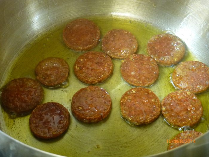 Чоризо нарезаем кружочками и обжариваем в кастрюле с толстым дном до золотистого цвета. При необходимости можно добавить оливковое масло (я не добавляла).