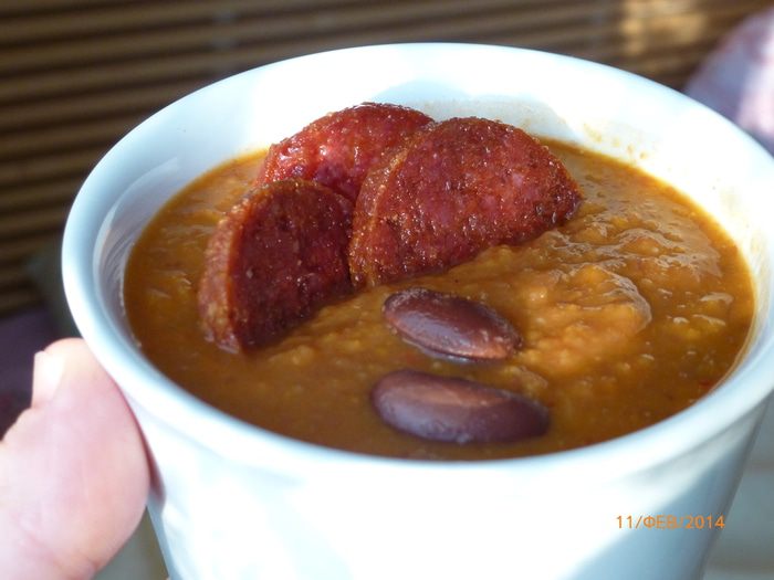 Измельчаем суп в блендере. Солим и перчим по вкусу. Готовый суп разливаем по тарелкам, украсив обжаренными кружочками чоризо. Приятного аппетита!