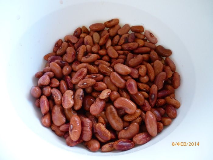 Фасоль необходимо заранее замочить в холодной воде и отварить до готовности. Я использовала фасоль пинто.
