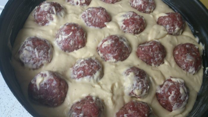 Форму для выпечки смазать любым маслом. Вылить тесто и равномерно распределить по тесту фрикадельки.