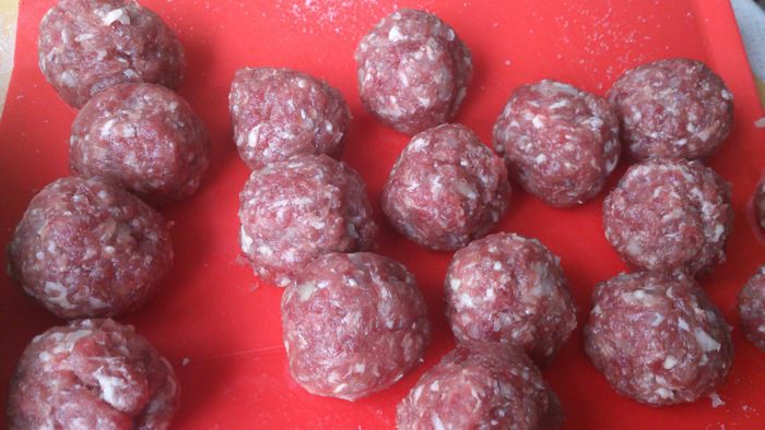 Прокрутить мясо, лук и чеснок в мясорубке. приправить. Фарш хорошо вымесить и накрутить маленьких фрикаделек. Отправить их в морозилку, пока готовится тесто.