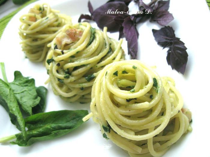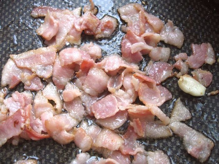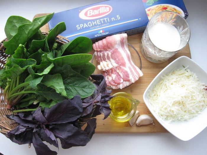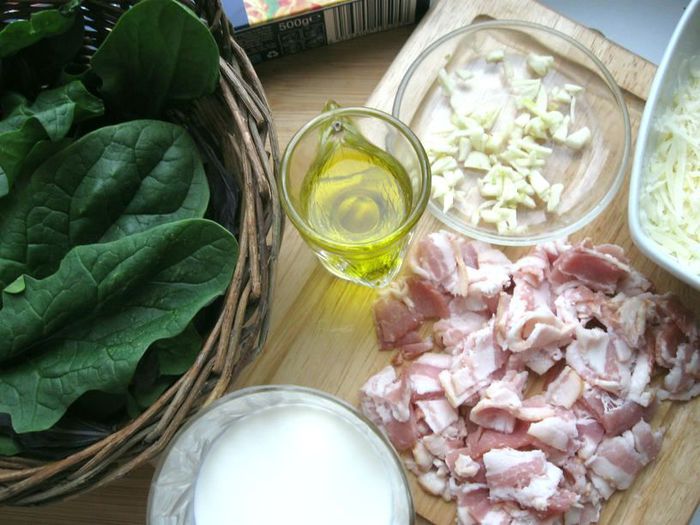 Бекон порезать на кусочки. Сыр натереть на крупной терке. Чеснок почистить и мелко порезать 2 зубчика. Листья базилика и шпината отделить от стеблей.