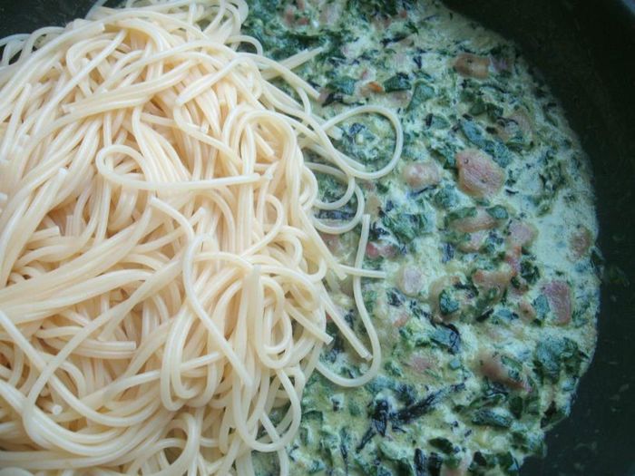 Спагетти опустить в 2 литра кипящей подсоленной воды. Варить 8 минут. Откинуть на сито, дать стечь воде. Соединить соус со спагетти. Перемешать. Несколько минут на сковороде на маленьком огне дать компонентам взаимно обогатиться.