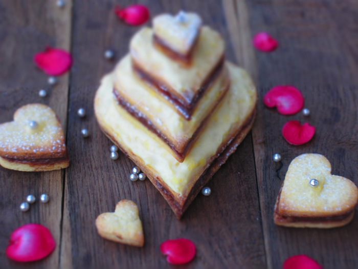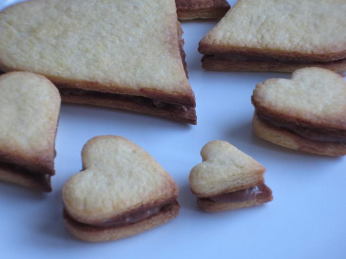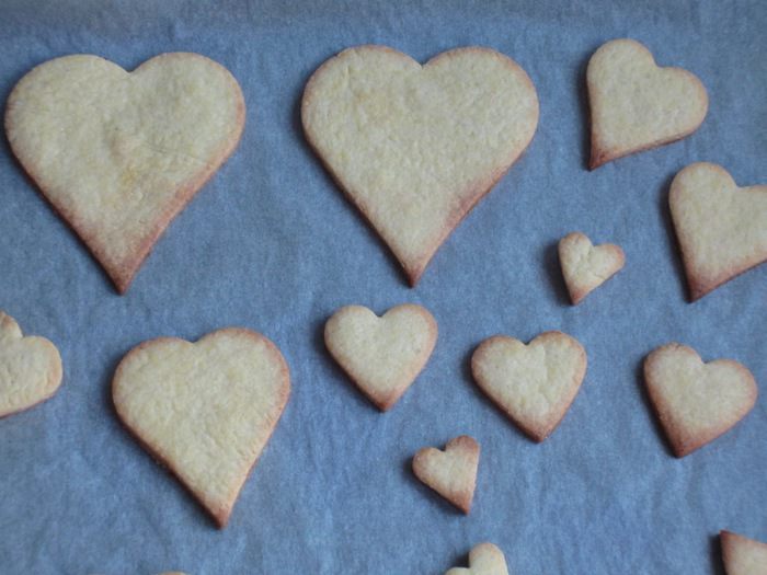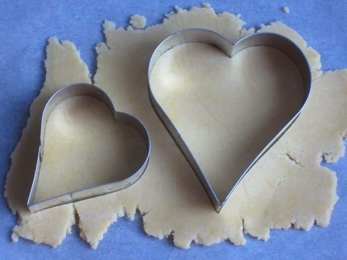 Тесто раскатать в пласт толщиной 3-4 мм и с помощью формочек вырезать сердечки (должно получится 12 парных сердечек).