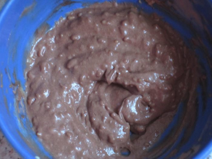 Крем разделить на две равные части, в одну часть добавить какао и хорошо перемешать.