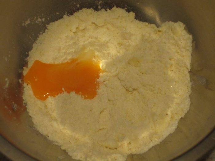 Тесто: Соединить муку, сливочное масло, нарезанное кубиками, соль, ванилин и растереть в крошку. Ввести желток и замесить тесто.