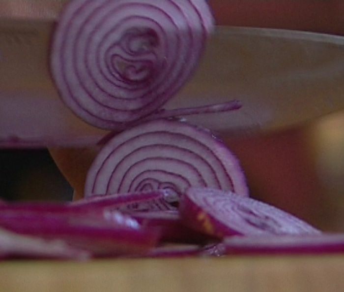 Красную луковицу и чеснок почистить, лук нарезать кольцами, а чеснок — пластинками.