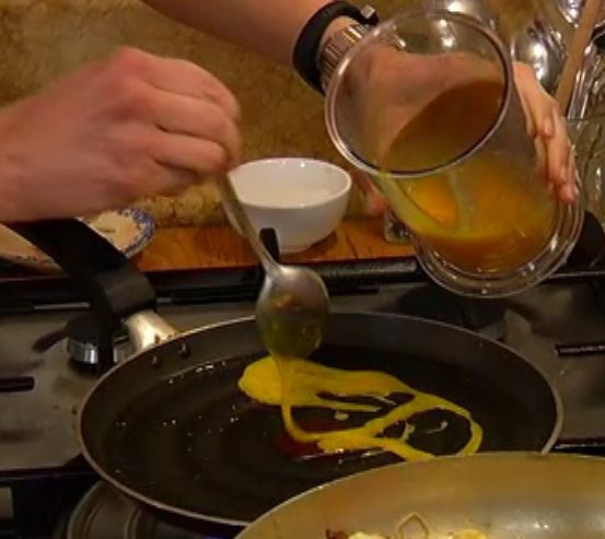 В отдельной сковороде разогреть оставшееся оливковое масло, ложкой вылить яичную массу на сковороду произвольными узорами и довести до готовности.