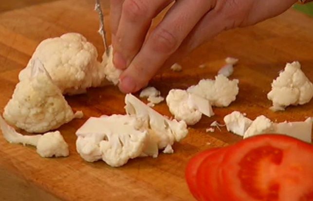 Цветную капусту разобрать на соцветия и нарезать небольшими кусочками.